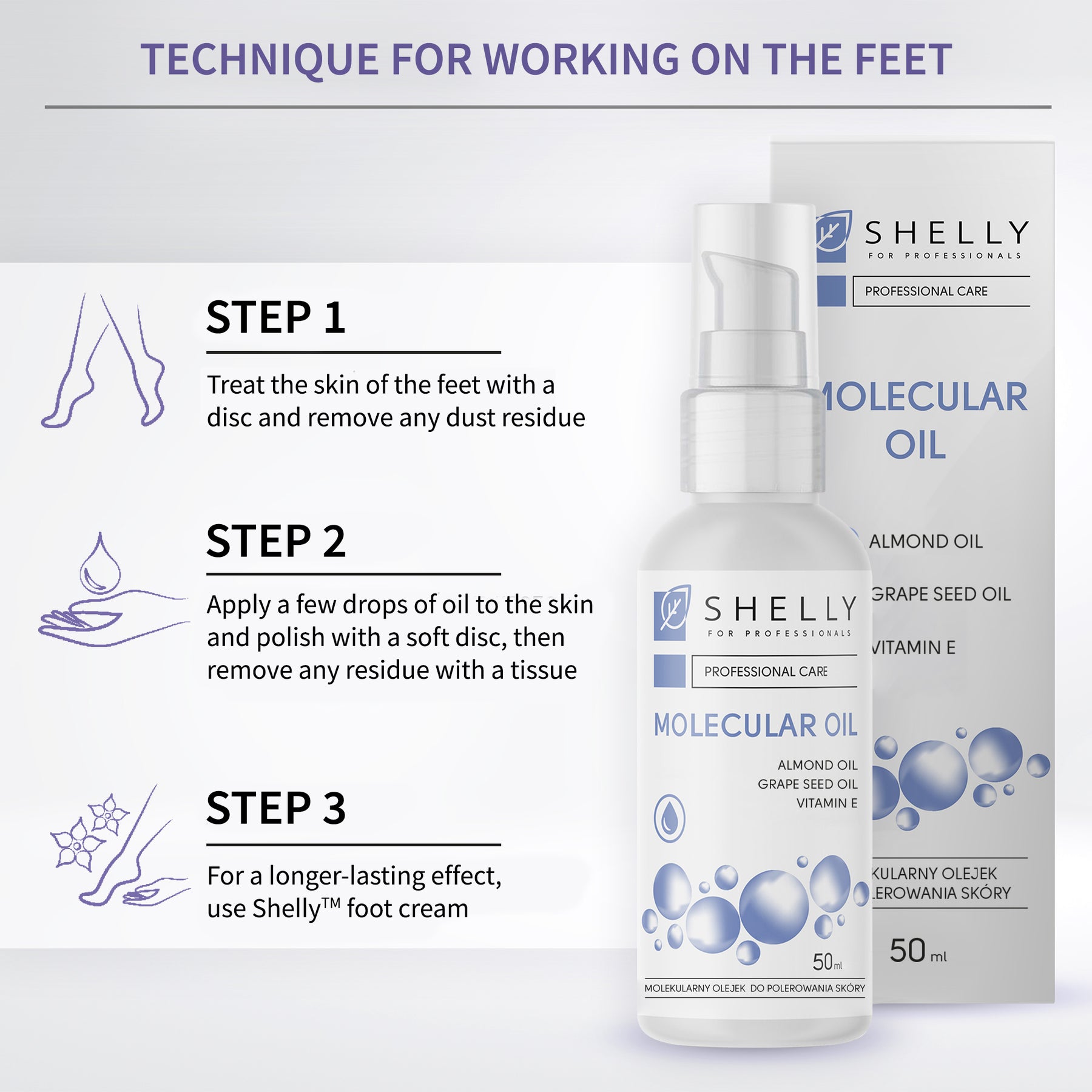 Shelly Molecular Foot Oil is expertly designed for polishing foot skin, featuring a light, oil-based texture and a pleasant aroma.